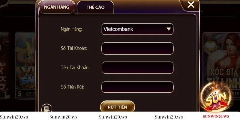Rút tiền Sunwin là quá trình chuyển $$$ từ tài khoản game về tài khoản ngân hàng hoặc thẻ cào. Mục đích của việc này giúp hội viên được phép sử dụng số tiền thắng cược vào các nhu cầu khác nhau như mua sắm, thanh toán, hoặc đầu tư. Nền tảng hỗ trợ nhiều phương thức đảm bảo anh em sẽ lựa chọn phương thức phù hợp và an toàn nhất.